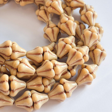 Beige bell glass beads with copper finish. Czech glass beads.