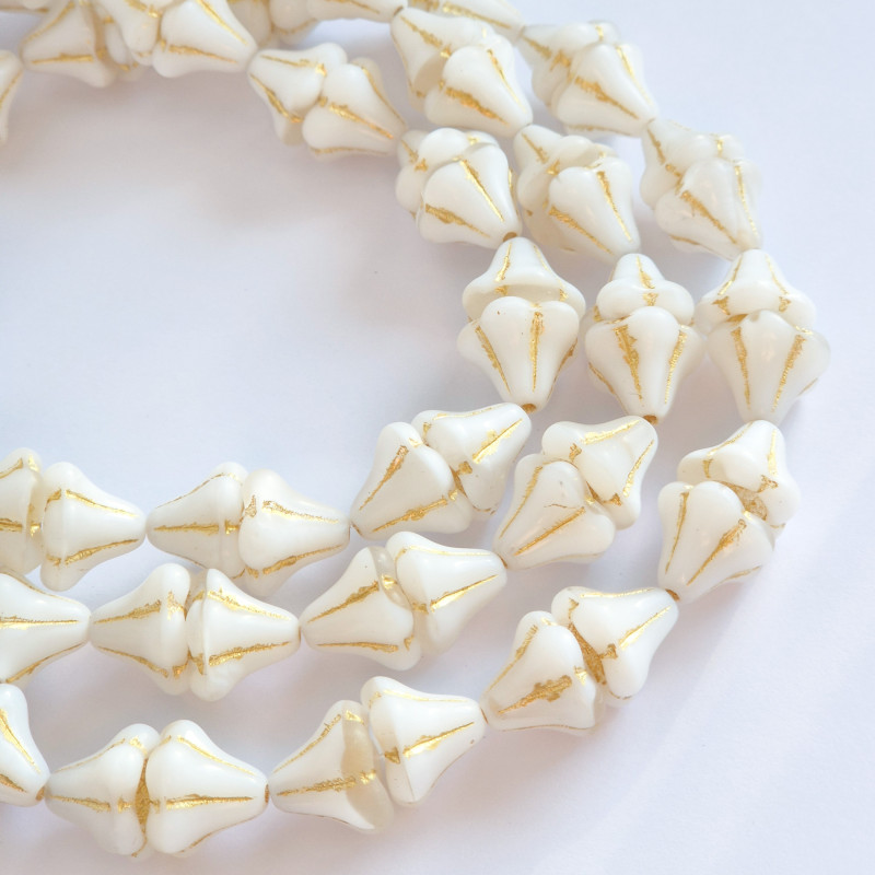 White glass bell beads with crystal accents and gold finish. Czech glass beads.