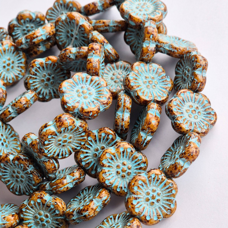 Dark travertine glass flower beads with light blue finish.