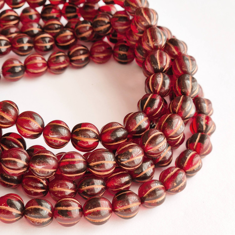 Transparent red melon beads with small black accents and copper finish.