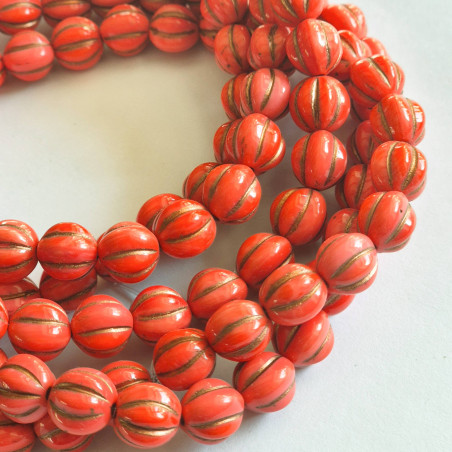 Coralline glass melon beads with copper finish.