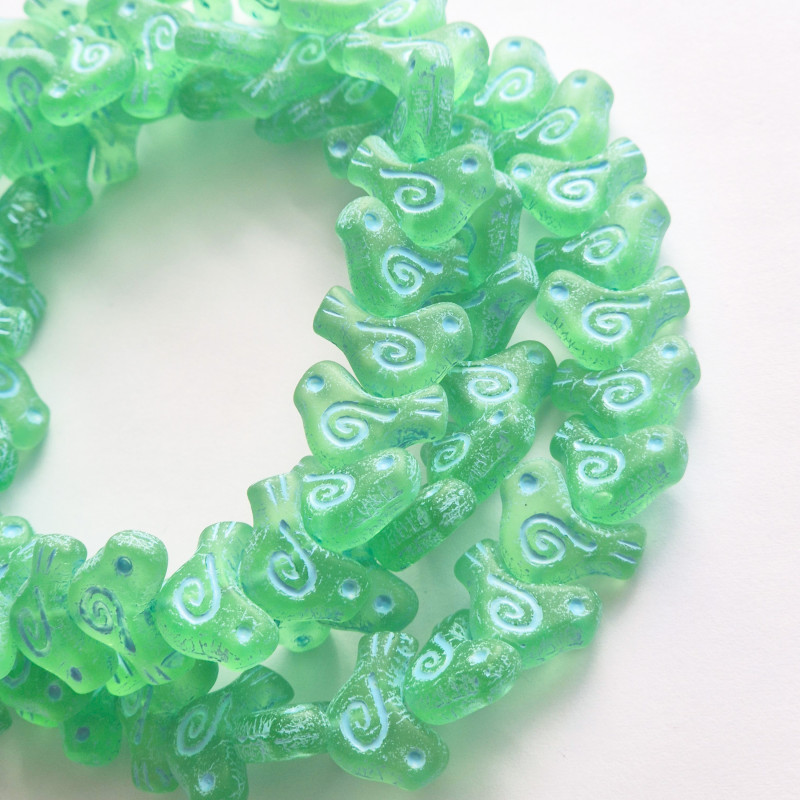 Green glass matte dove beads with light blue finish. Czech pressed glass beads.