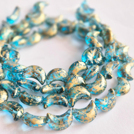 Transparent aqua moon beads with gold finish.