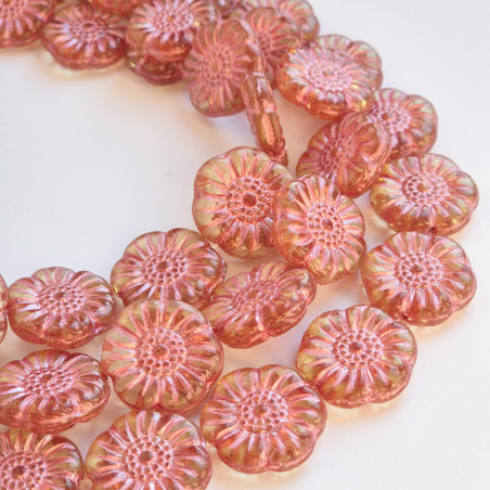 Light yellow glass flower beads with pink metallic finish.