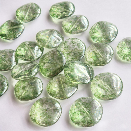 Crystal glass flat bead with green luster.