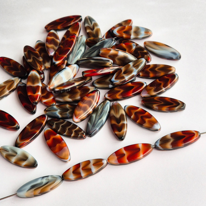 Glass oval beads with red, grey and brown accents 24/9 mm.